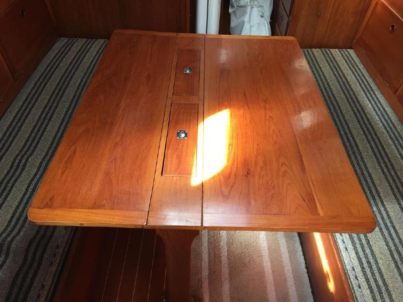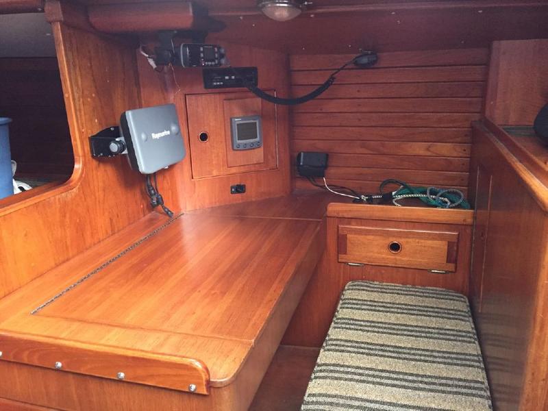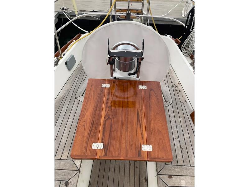 The boat was repowered, and a teak cockpit installed by the second owner complete with Harken electric winches and Raymarine electronics as well as roller furling, windlass, and anchor bow roller.