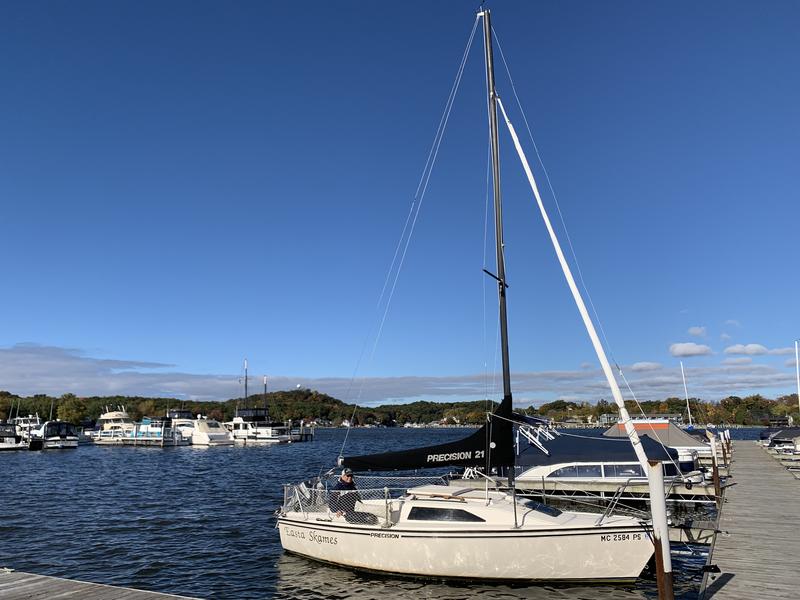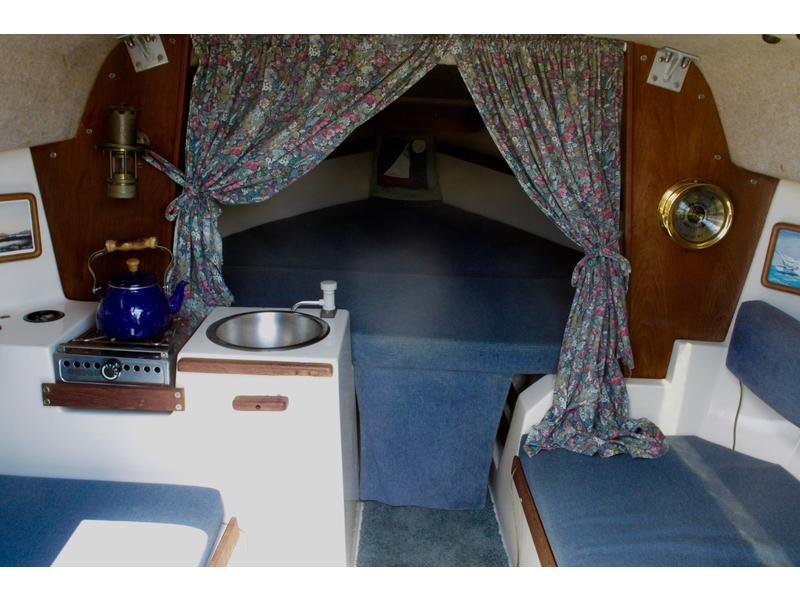 Cabin has 50" headroom with berths for 4 adults, fabric covered cushions, alcohol stove, stainless steel sink, cooler, storage compartments, porta-potty under V-berth 135% roller furling genoa with well-placed lower window. Mainsail has 112 area with boom vang and jiffy reefing system with one reef point. Jib sail, sail covers, tiller cover. Performance trailer Yamaha 6 hp long shaft outboard motor Safety: Plastimo Contest cockpit compass, life preservers (2 adult, 1 child), harness with attachment strap, fire extinguisher, 2 throwable cushions, anchor, bilge pump, air horn, fenders, dock lines Shore power with 30-amp cord, mosquito netting, cockpit tent, plus many extras! |