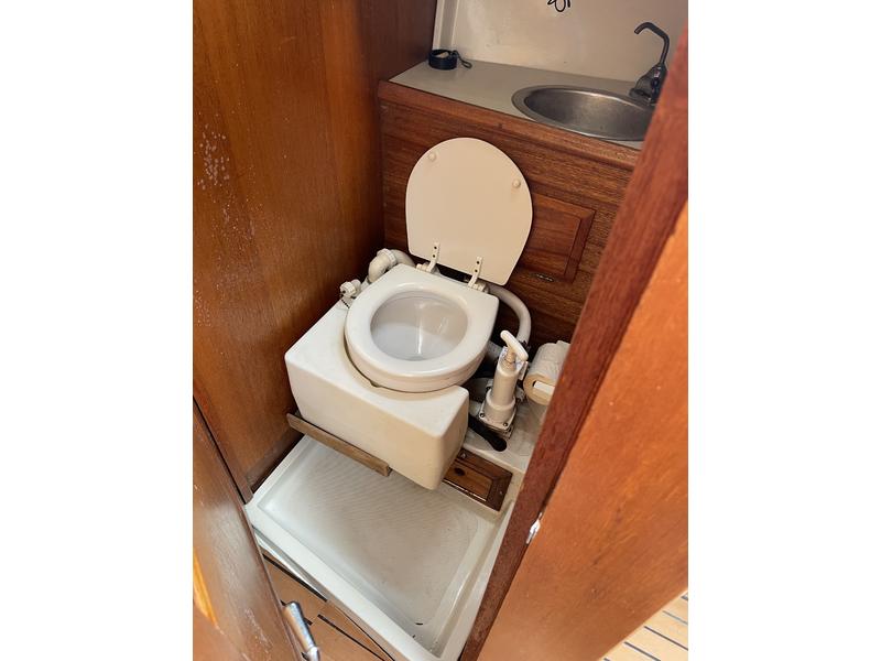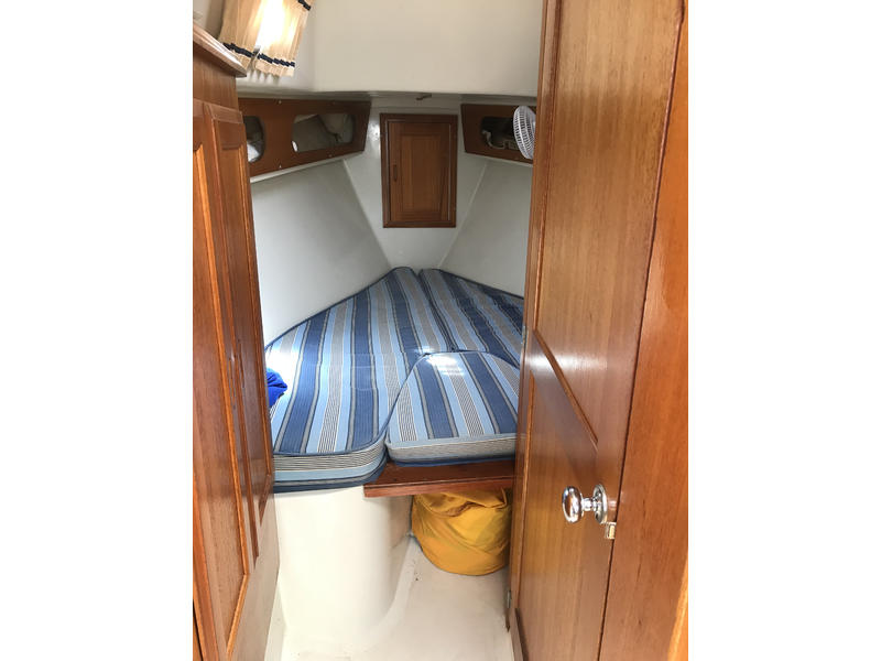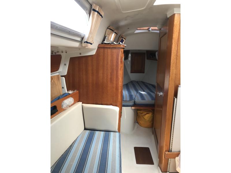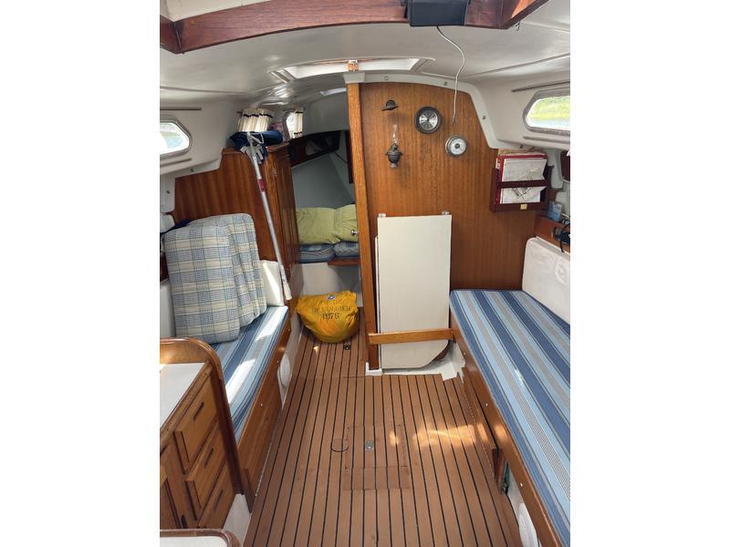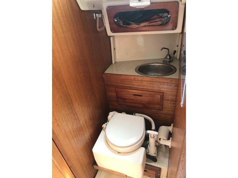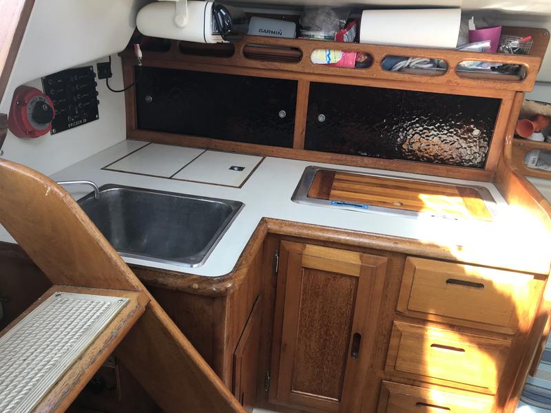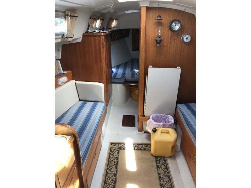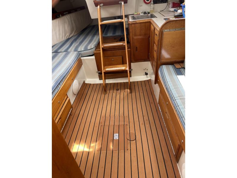 lots of nice teak interior, ice box, stove, head, swim ladder