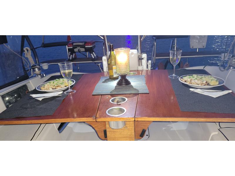 - Large cockpit custom made folding teck table with cup holders and storage.