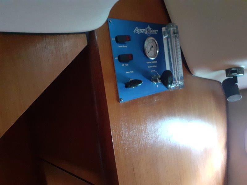 - Very efficient Aqua Maax water maker (23 gal/hour) with a new high pressure tube and membrane (2024) that provides very low PPM water that is excellent to drink