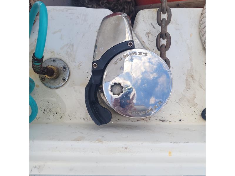 - New Lewmar electric windlass (2024) with a water hose beside.