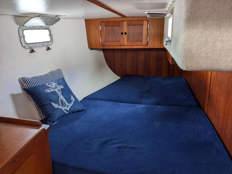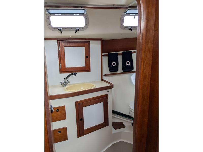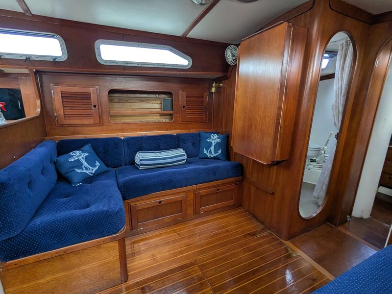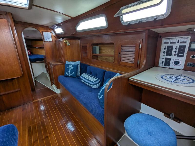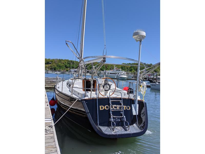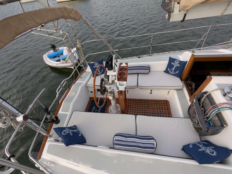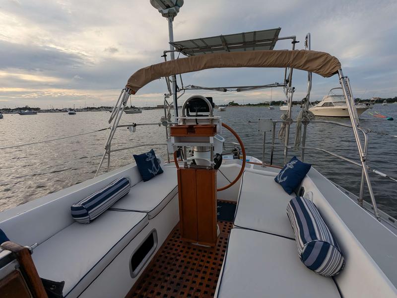 Swim Platform. Martek Davits and crane. Teak Wheel and cockpit table. 240 watts Solar Panels, 2-100 Amp Hour LiFePO4 House Batteries (2025). 2-Dual Purpose Starter Batteries. Large Bimini top and dodger. Cockpit cushions.