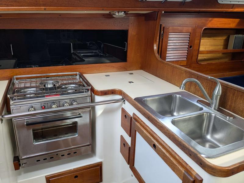 Teak interior with hot and cold water, refrigerator, propane gimbled stove with oven. Two aluminum propane. Ample storage. Head with hot and cold shower.