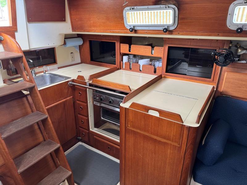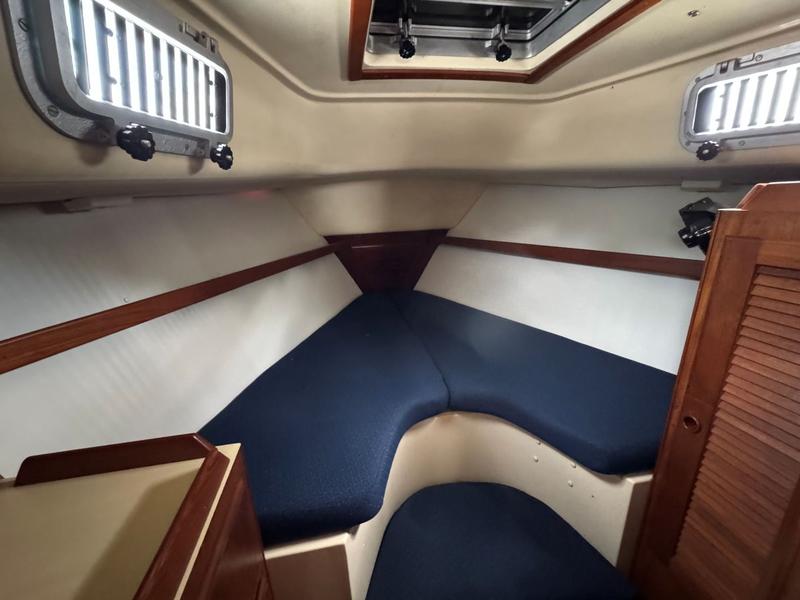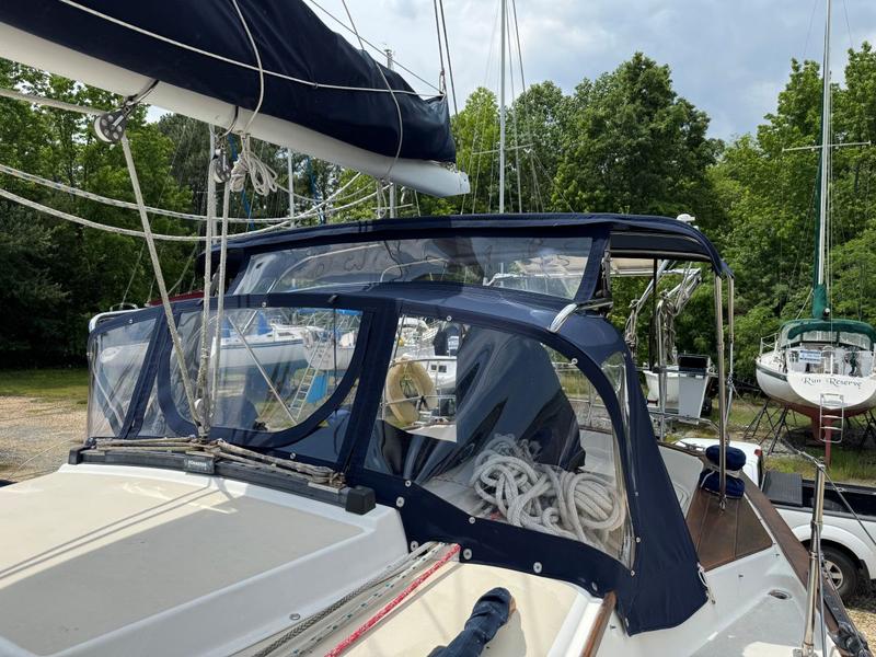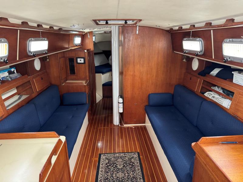 Perkins 4108 42hp inboard diesel, wheel steering, Jib and main dacron Quantum sails in good condition, Mack Pack sail cover, winter sail cover, dodger, swim ladder, lifelines, cockpit cushions, bow thruster, anchor well and windlass, dinghy davits, swim ladder. Bulkhead woodwork replaced last fall. Hull barrier coated in 2022. Canvas replaced in 2022. Teak cabin sole, sleeps 6, pressure, hot water, shower, marine head, V-berth mattress cover, fridge, stove, oven, GPS, chart plotter, VHF, 4 batteries, alt, battery charger, nav lights