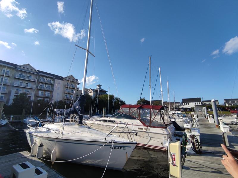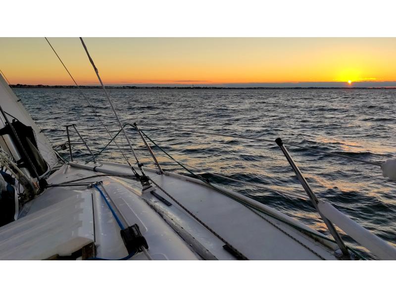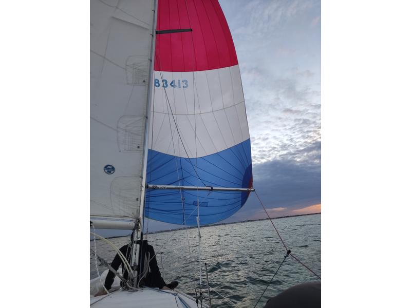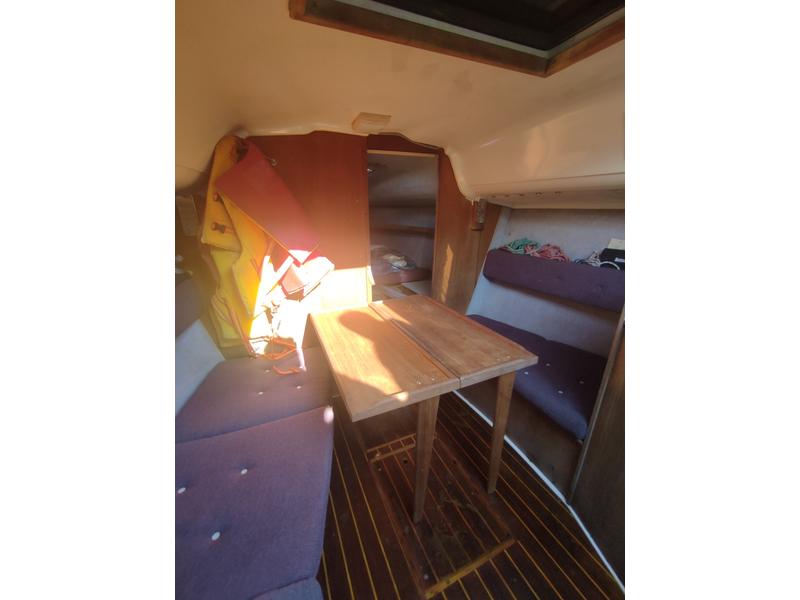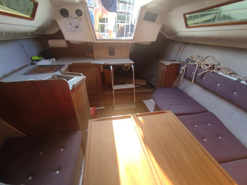 2 sail sets (including main sail but only 1 front sail 1), 1 regular, 1 kevlar 2 spinnakers steering stick for tailed rudder, American and French flags, 6 life jackets, 5 hp off-shore engine, portable VHF, mast harness, trolling gear, water tanks ok, bilge pump, all sail sheets ok, all halyards ok, moored in Baypoint Marina ($249.02/month), all matresses ok. Compass to replace, VHF equiped (turns on and off but don't know if effective or not, previous owner suspected an issue with antenna), sink unconnected to water tanks (to be reconnected if neede), gaz hob ok but no gas bottle |
