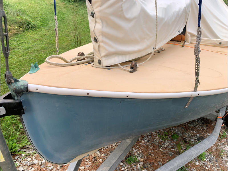 In very good condition, Howard Boats built this fiberglass (blue gelcoat) version of the famous Beetle Cat sailboat. It is the same as the original in every respect except for the fiberglass hull and deck. It is a sturdy, dry boat, and sails like a dream. A number of upgrades have been made to itmost notably a carbon fiber mast sleeve has been added so it can be trailed fully rigged, with launch taking less than 10 minutes. An electric outboard motor bracket attaches to the starboard aft side deck; Spectra shrouds have been added and white PVC gunwhale guard was added at the gunwhales; additional cleats were added to the deck surface; halyard rigging was added to the top of the foredeck; a drain plug was added to insure drainage during winter storage. Includes a cockpit/ sail cover. A Galvanized trailer in good condition with new lighting is also included. The sail is serviceable but, it does have a proper repair. A great little daysailer-lots of fun and easy to sail. $5,500 OBO