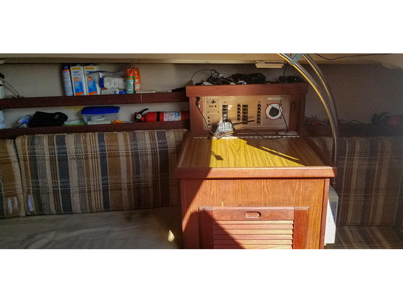 Chart desk, 12V lighting & shore power outlets throughout cabinnate