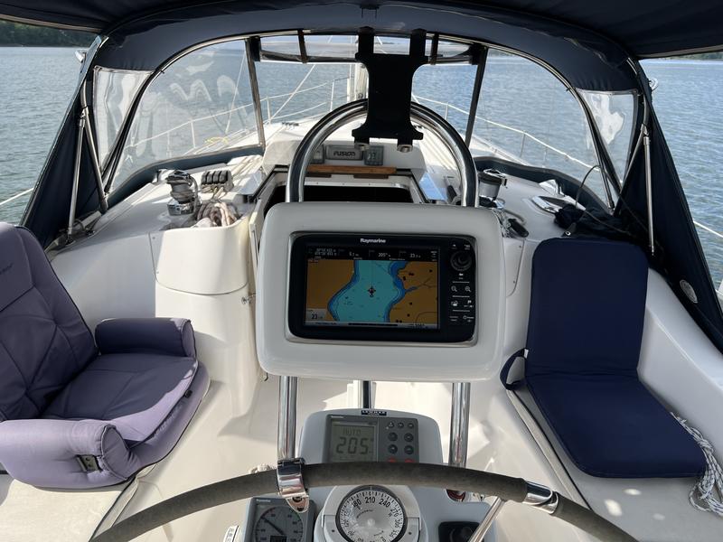 Raymarine MFD, autopilot, GPS, speed, depth, wind, radar, AIS. VHF on binnacle, nav station, and handheld