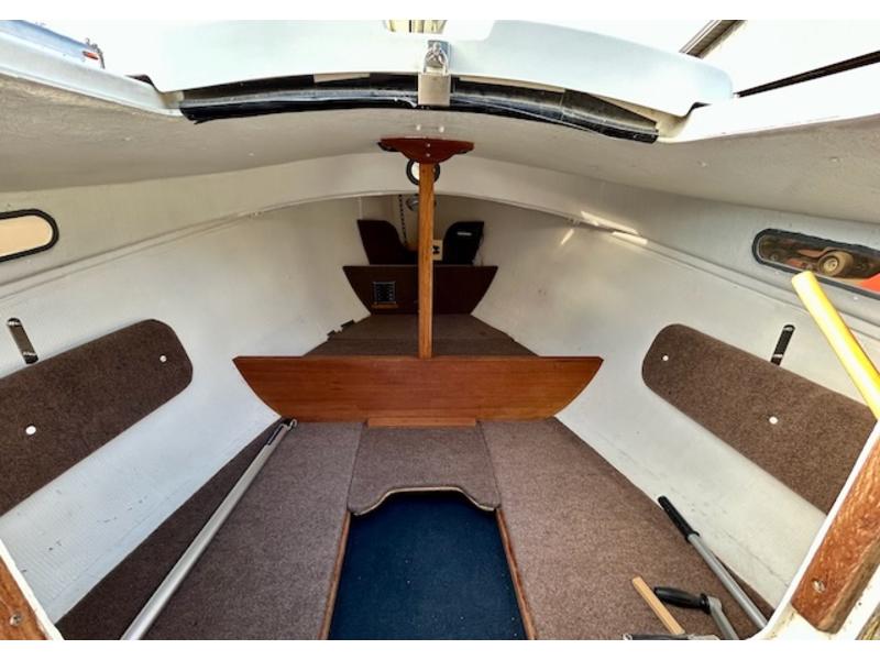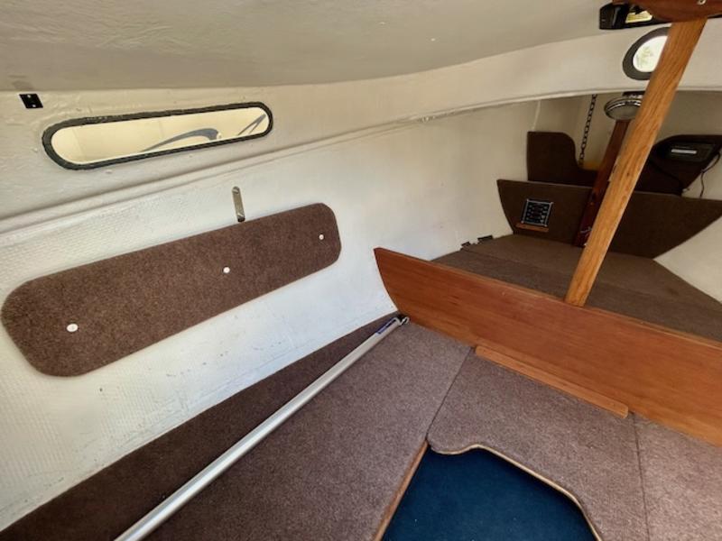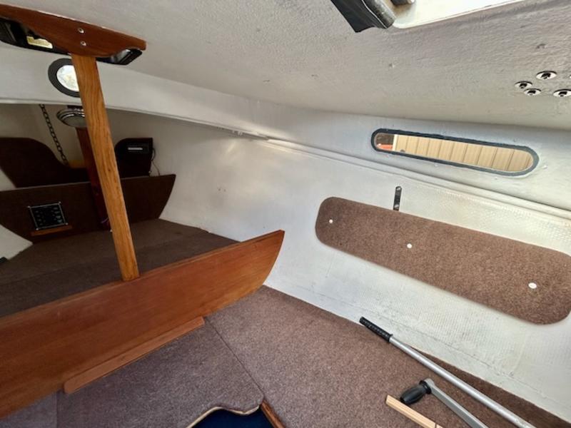 2024 new mainsail from Com-Pac Yachts (never used); old mainsail (original?) is serviceable and setup for single line reefing with a downhaul line led aft to the cockpit. Boom vang.