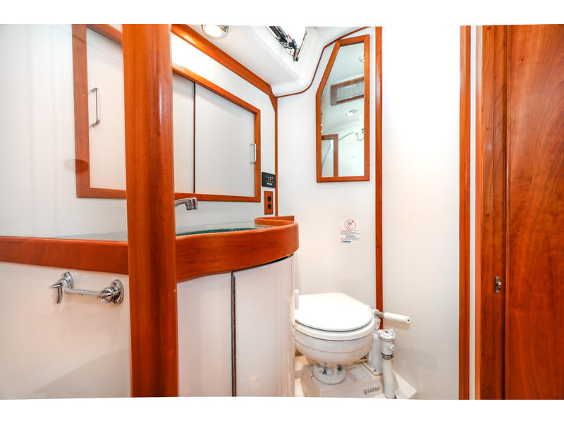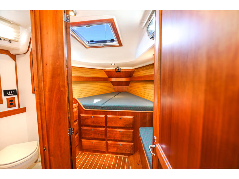 WHITE ROSE has a spacious, well-appointed interior, designed for comfort and practicality and featuring warm finishes with elegant joinery. LED fixtures provide good illumination after dark. The salon has port and starboard settees, with a folding table to maximize space. four opening ports, a large hatch and two Dorades provide excellent ventilation. There are conveniently placed hand holds throughout the salon. The forward cabin has a large V-berth. Several large drawers, a cupboard, a hanging locker, and lockers beneath the berth provide ample storage. There is a large hatch and an opening port for ventilation. The aft cabin has a double berth, three overhead lockers and a hanging locker. There are two opening port lights, and an overhead hatch. Additional storage is available beneath the berth. The head is spacious and includes a separate, enclosed, stall shower. The manual Raritan PHII marine head has a 30-gallon holding tank. There is a countertops, sink, and storage cabinet above. An opening hatch and two port lights provide excellent ventilation and natural light. |