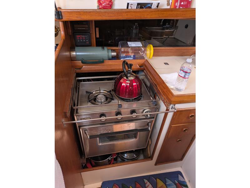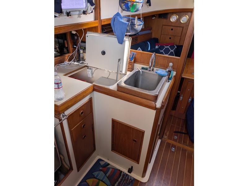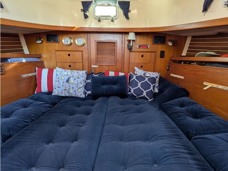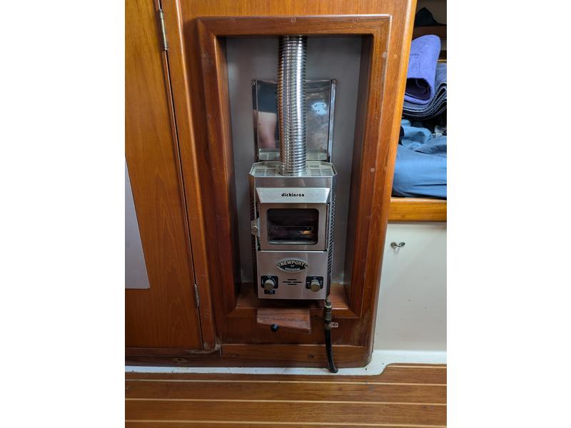 Interior is clean and in very good shape, with sleeping space for 56. The cushions and woodwork are in great condition. The galley has a propane stove, 12V refrigerator, deep stainless sink, and hot water from engine or 110V. A propane Dickinson heater provides dry, reliable heat aboard. The head has been upgraded to an Air Head composting toiletno holding tank, no odor, and much simpler to maintain.