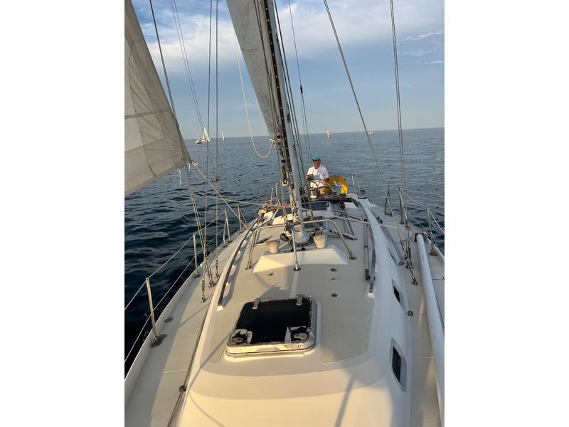 1985 Ericson 35-3. 35.5 LOD. 6 draft. 114 beam. 13,000 lb. displacement. 5200 lb. lead keel. Repowered with reliable Yanmar 3GM30F much smoother, and quieter than original Universal. Chrome Anderson 46 ST sheet winches. CNG 3-burner stove and oven. Forced hot air diesel heat. Solar power. Hot and cold pressure water. 85 gallons water in 3 separate tanks. 40 Gallons fuel. 25 Gallon holding tank with manual overboard pump. 44 lb. Bruce anchor. Spinnaker set up but no spinnaker sail. 130 (approx.) RF genoa. Hydraulic backstay adjuster. Has fittings for lazy jacks but no lazy jacks installed at this time. Has dodger rail but no canvas. Limited electronics including older GPS, depth, and VHF. Setup for SSB. Masthead tricolor for offshore sailing and deck lights.
